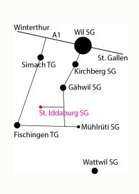 Der zweite Weg führt über Sirnach TG nach Fischingen TG, dann nach dem Kloster links abbiegen in Richtung Hulftegg. Auf der ersten Anhöhe beim Wegweiser links in Richtung Gähwil SG fahren. Etwa 300 m nach der Passhöhe dem Wegweiser links nach der Iddaburg folgen.